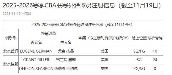 其中,北控注冊(cè)了格蘭特·里勒和德瑞恩·西伯恩;北京注冊(cè)了尤金·杰曼。