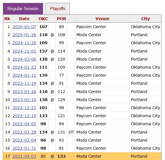 本場(chǎng)比賽過(guò)后,開(kāi)拓者終結(jié)了自己面對(duì)雷霆的16連敗,上次他們贏雷霆還是在2021年4月4日。