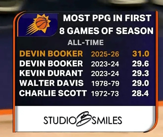 賽季前八場,布克場均砍下31分,是隊史開季前八場的最高場均得分。