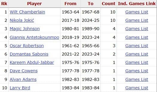 據(jù)統(tǒng)計,這是約基奇生涯第11次以70+%命中率砍下30+三雙,超張伯倫(10),獨享歷史第1。