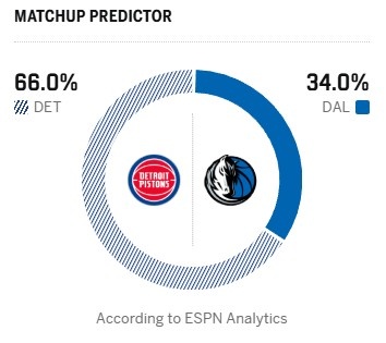今天ESPN給出本場(chǎng)獲勝概率預(yù)測(cè),獨(dú)行俠僅34.0%,活塞高達(dá)66.0%。