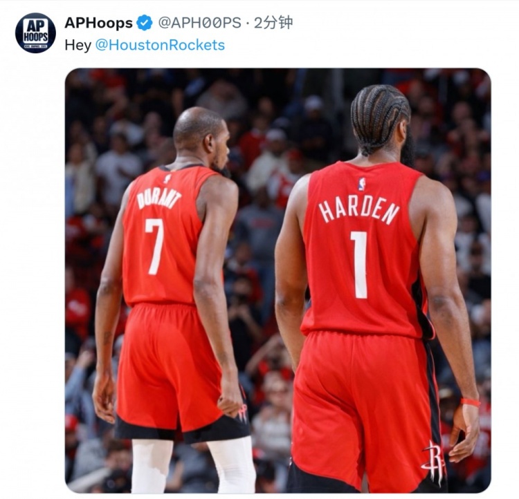 賽后快船媒體APHoops曬出哈登身穿火箭球衣、與杜蘭特同框的P圖,寫道:“嘿@火箭?!?