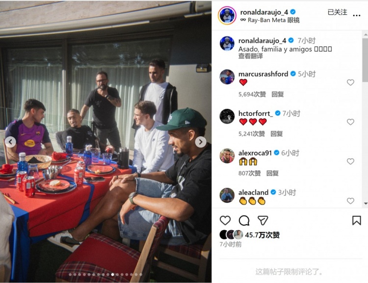 11月12日訊 巴薩中衛(wèi)阿勞霍更新社媒動(dòng)態(tài),曬出與隊(duì)友們聚會(huì)的照片。