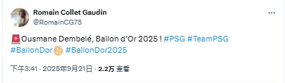 該記者表示:“奧斯曼-登貝萊,2025年金球獎(jiǎng)得主!”這位記者供職于多家法國正規(guī)媒體,有比較高的可靠度。