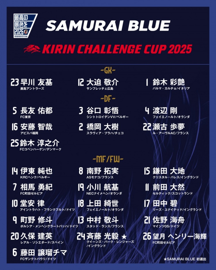 門將:23-早川友基(鹿島鹿角)、12-大迫敬介(廣島三箭)、1-鈴木彩艷(帕爾馬)