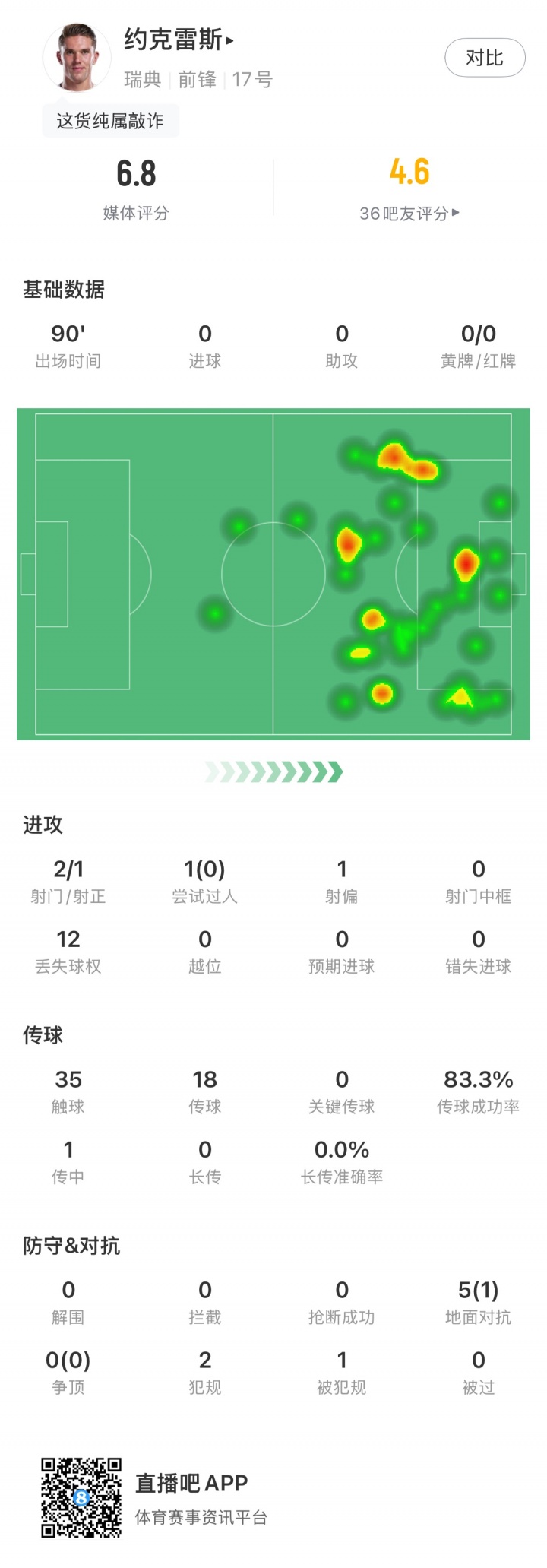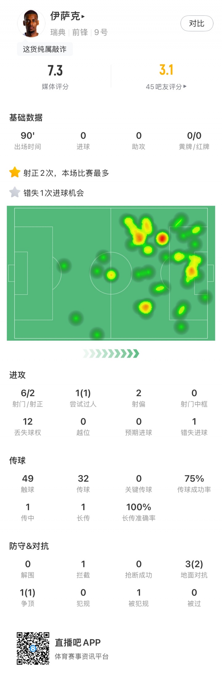 本場約克雷斯、伊薩克均首發(fā)打滿全場,伊薩克全場6射2正0球,1次錯失良機(jī)。約克雷斯數(shù)據(jù)為2射1正0球。