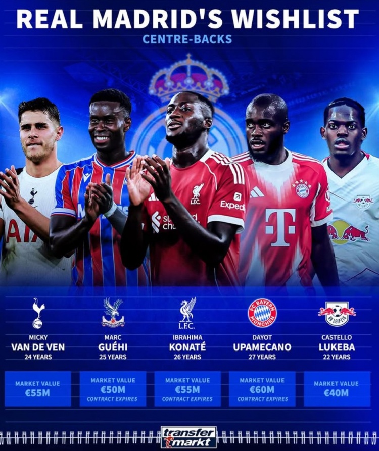 11月9日訊 皇馬希望在明年補強中衛(wèi)位置,《轉(zhuǎn)會市場》也列出了皇馬的5大候選目標(biāo):