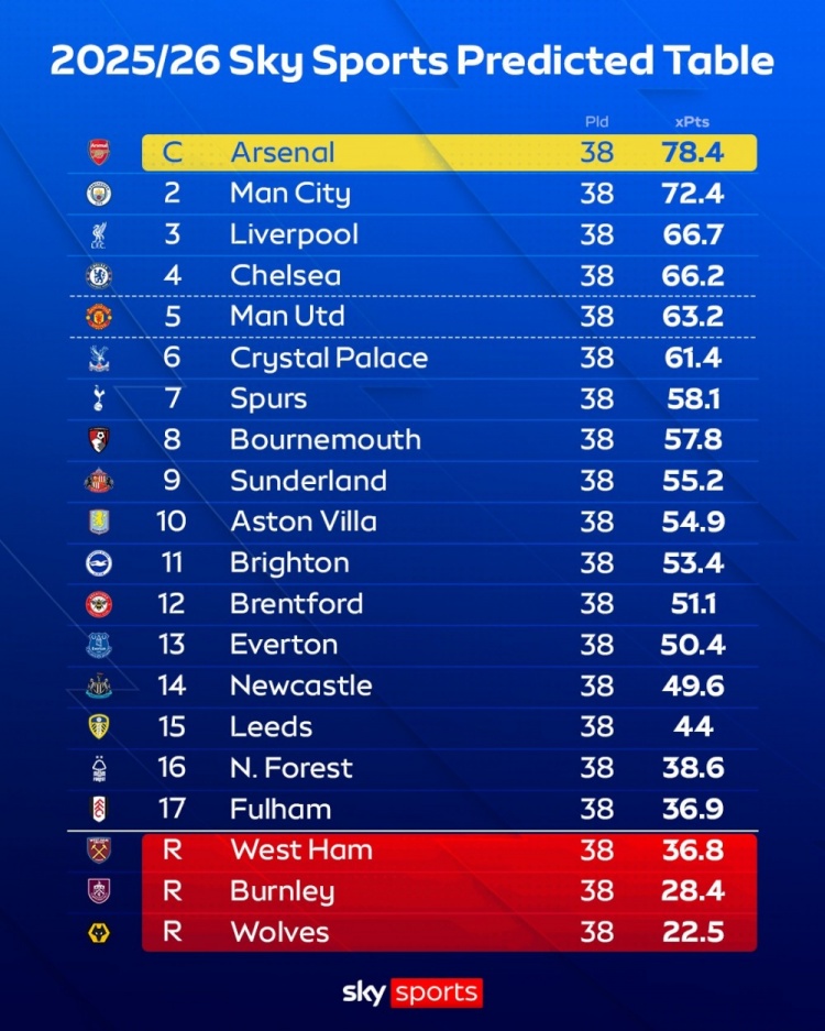 天空體育預(yù)測本賽季英超最終排名(積分為模擬10萬次的平均值)