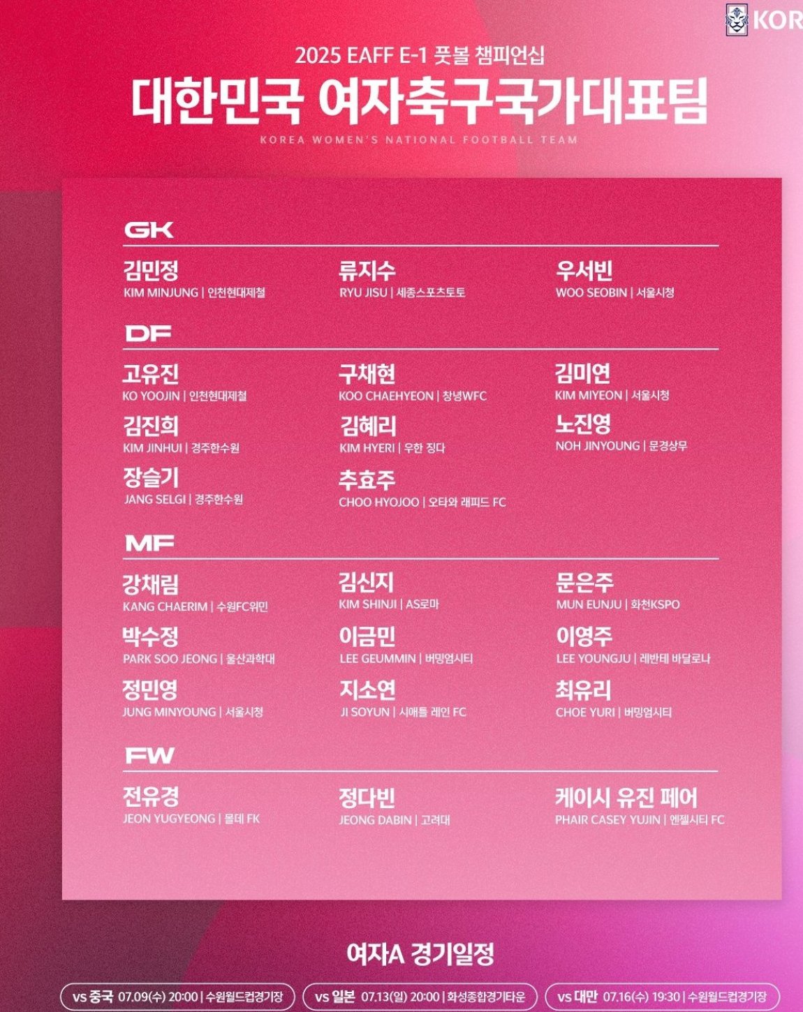 06月23日訊 韓國足協(xié)公布韓國女足東亞杯23人名單,這份名單由9名海外俱樂部球員、12名本土聯(lián)賽球員以及2名大學生球員組成。根據(jù)賽程,東道主韓國女足首戰(zhàn)7月9日19點對陣中國女足。