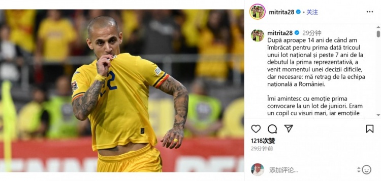 米特里策在社媒寫道:“在首次穿上國家隊球衣近14年、完成一線隊首秀逾7年之后,我迎來了一個艱難卻必要的決定:從羅馬尼亞國家隊退役。