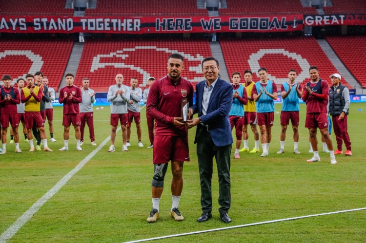 今天的官方訓(xùn)練開始前,俱樂部為兩位球員舉行頒獎儀式。俱樂部總經(jīng)理沙良昌為萊昂納多頒發(fā)第25輪最佳球員獎杯,為李帥贈送百場紀(jì)念球衣。