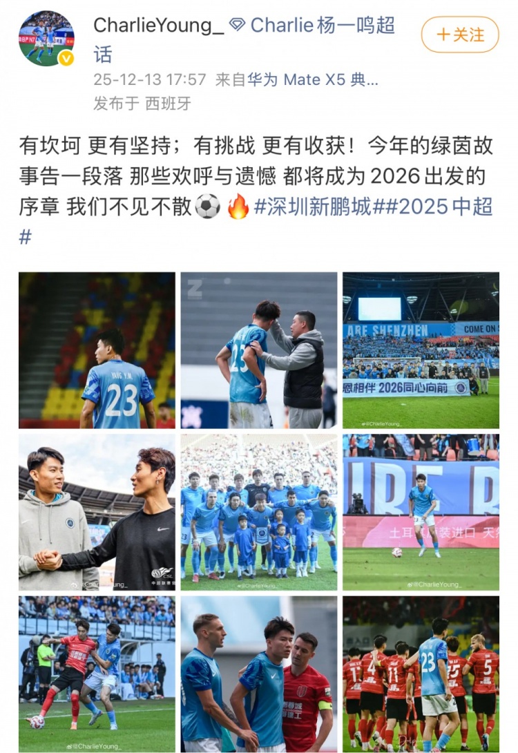 楊一鳴在社媒寫道:“有坎坷,更有堅持;有挑戰(zhàn),更有收獲!今年的綠茵故事告一段落,那些歡呼與遺憾,都將成為2026出發(fā)的序章。我們不見不散!”